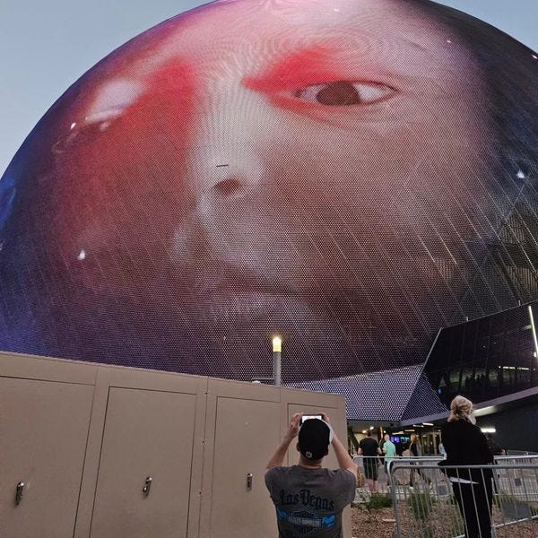 U2 is as U2 does but that's not why I flew to Vegas or why people in that arena were paying upwards of $500 (in some cases alot upwards) to see them there either: they were paying to experience the Sphere. Certainly, that's what I myself went for, but while I am happy that I was able to see it because it truly was something else, I left the city feeling a little bit tawdry for having bought into it all, and with pretty negative feelings about that arena, especially since my last sight of it, as the plane was lifting off and the lady next to me was enthusing to her seatmate over the showers of video pixels that had fallen on her the night before, was of it covered in a giant picture of some WWE wrestler in a particularly hideous ad for that event.