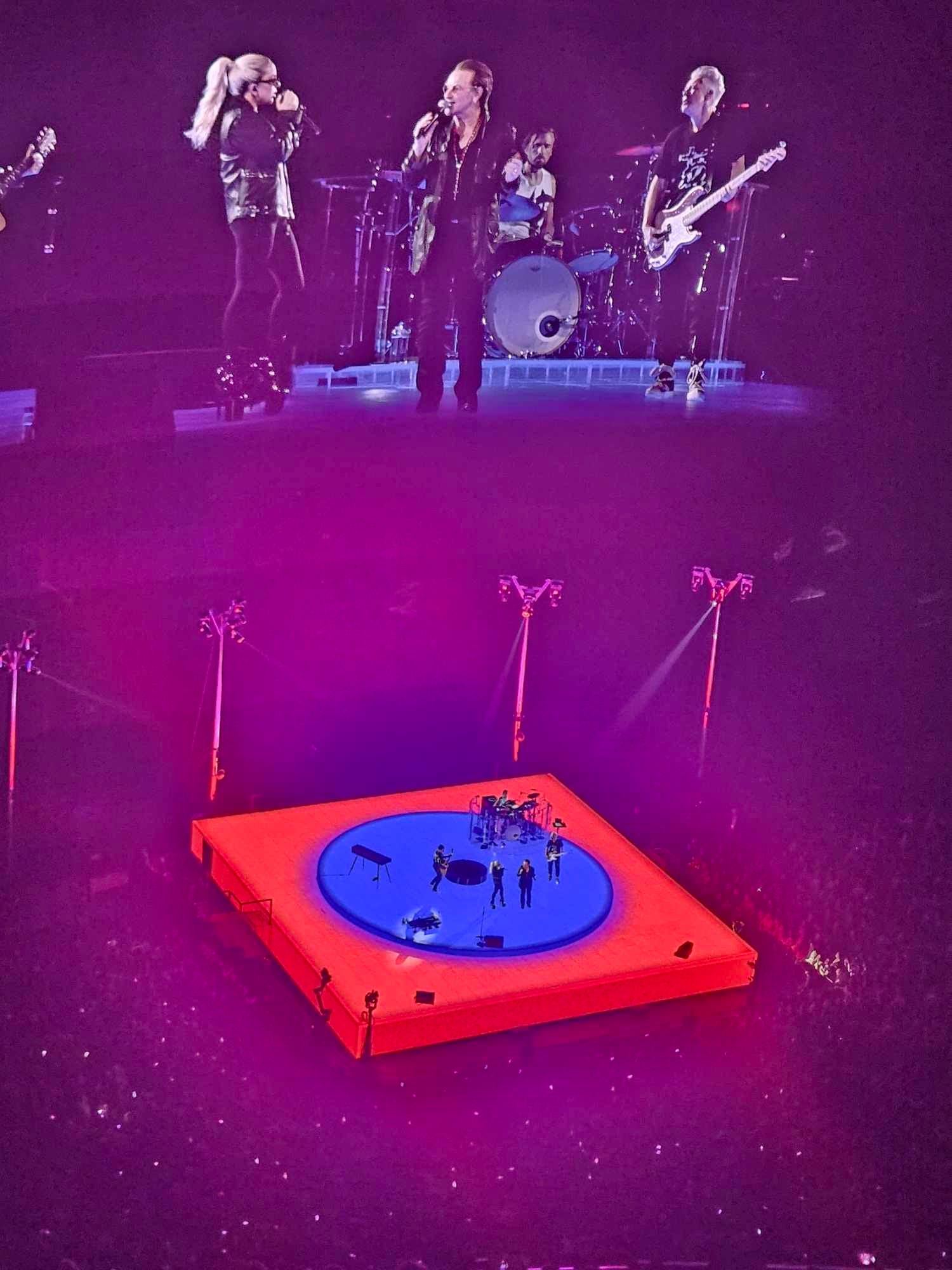 Anyway, whatever you think of U2's lyrical content, Bono is a great singer, and Edge is an inventive guitarist, and when they walked on stage, I was happily reminded of the power of a band qua band: four men in that configuration is just...a devout thing to me. This concert was no different than any other U2 concert in that way: for all the special effects -- and U2 gives new meaning to the word ‘special’ -- this was just a U2 concert, (with a special guest, Lady Gaga). To their enormous credit, the show would have been the same amount of absorbing even if you took away the lights and the films and the majesty of it all: they don't need the Sphere as much as the Sphere needs them.